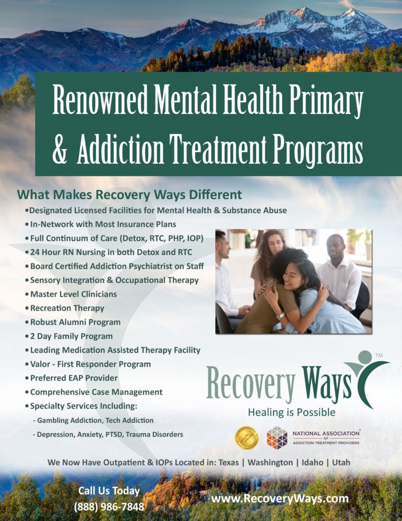 At Recovery Ways we have over a decade of experience helping those who are seeking to improve their mental health including specializing in supporting healing with anxiety, depression, bi-polar disorder, PTSD, and more. We have a thriving alumni program with many who support each other in their new found freedoms of a life of sobriety. We offer a wide range of services including Detox, Residential Treatment, PHP, and IOP therapy to help those in need. Please contact us today if we can be of assistance in getting your life unstuck and back to finding more purpose and joy. We accept most major insurances.